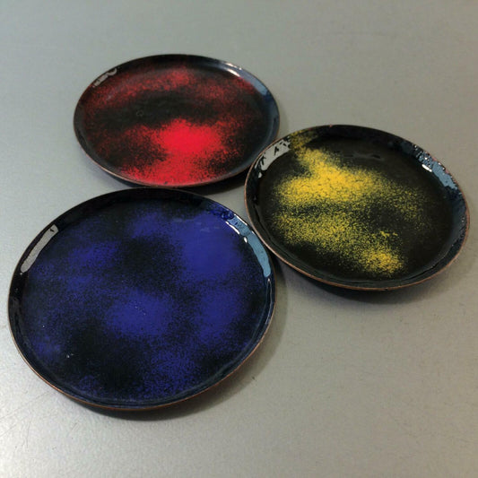 3 Untersetzer emailliert Teller Emaille D 7,6 / 7,4 cm 50er 60er KUPFER