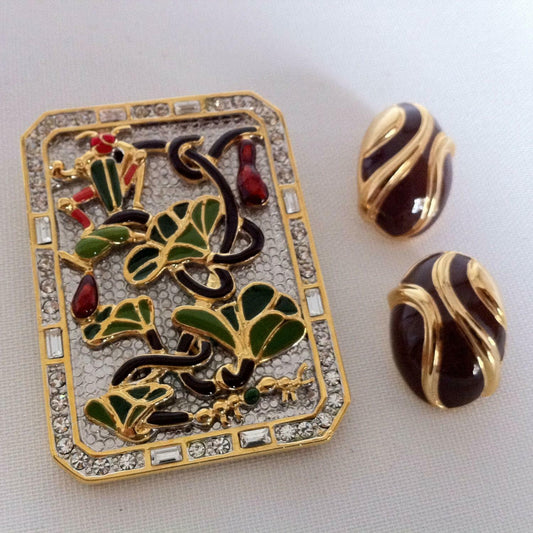 SchmuckkonvolutBrosche Laura Valoré & Ohrchlips golden mit Steinen KONVOLUT