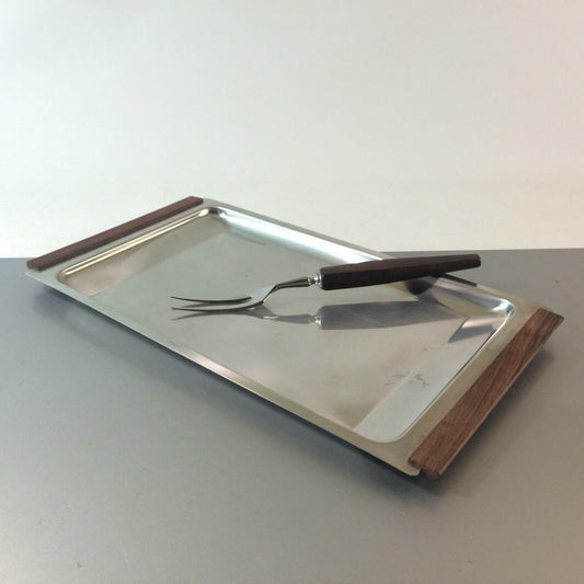 Tablett EDELSTAHL & Holz Teak MID Century 50er 60er 38 cm x 21 cm GABEL