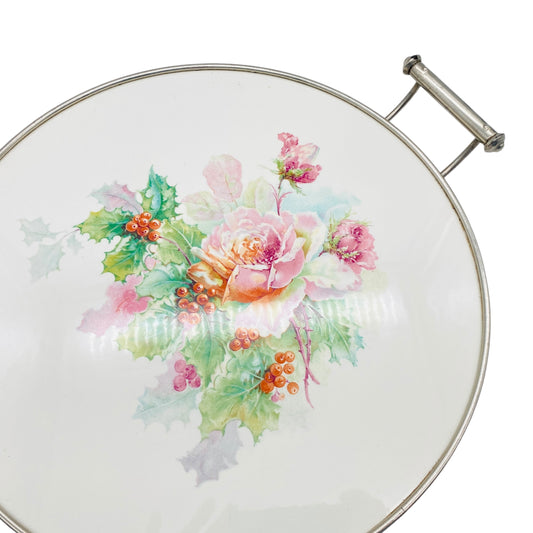 Mid-Century Tortenplatte Porzellan Metall Halter Rosen Stechpalme 40er 50er