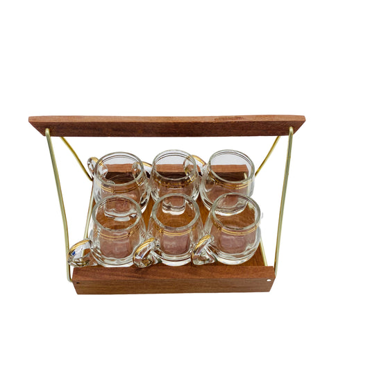 Schnapsgläser mit Tablett Halter Holz Mid Century Glas 60er Jahre