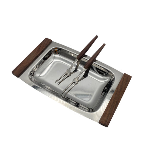 QUIST Schale Tablett mit Pickern Gabeln Edelstahl Holz 60er 70er Jahre