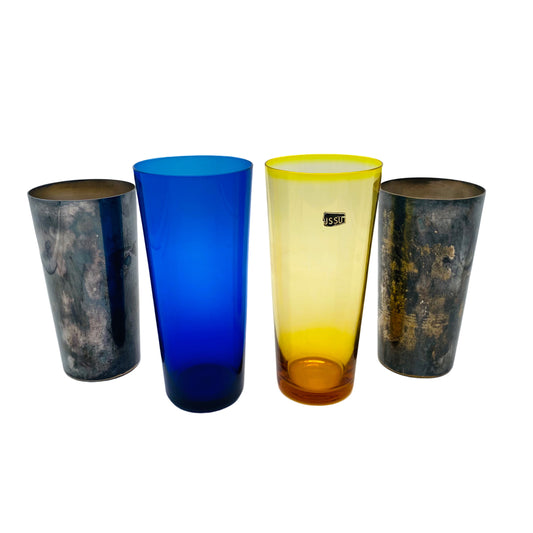Longdrinkgläser blau gelb Halter versilbert Mid Century 60er Jahre