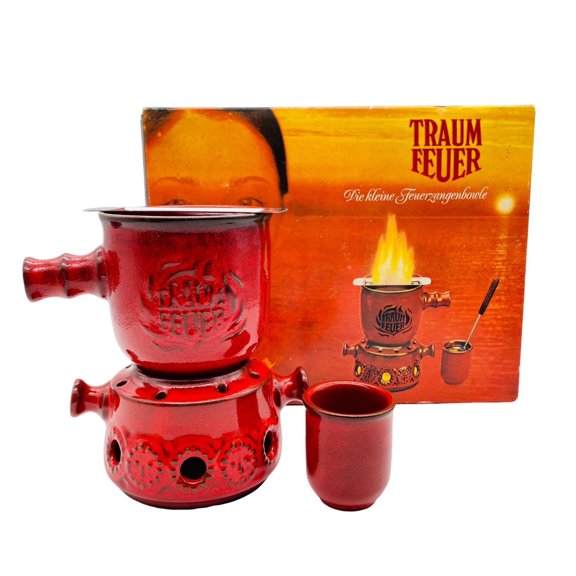 Klassisch-schönes Feuerzangenbowle-Set aus rot glasierter Keramik im Mid Century-Stil der 60er und 70er Jahre. Inklusive Stövchen und Halter für den Zuckerkandis. Perfekt für gemütliche Abende mit Freunden und Familie. OVP noch vorhanden.