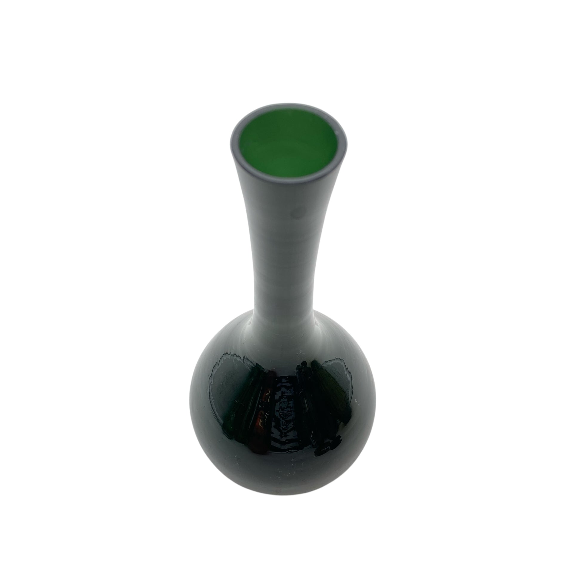 Diese Mid Century Vase aus grünem, olivegrünem Glas besticht durch ihre geschliffene Öffnung und verkörpert das Design der 60er und 70er Jahre. Sie eignet sich ideal als stilvolle Dekoration für das Wohnzimmer und ist ein begehrtes Sammlerstück für Liebhaber der Epoche. Die hochwertige Verarbeitung und das charakteristische Farbspiel machen sie zu einem zeitlosen Highlight in jedem Interieur.