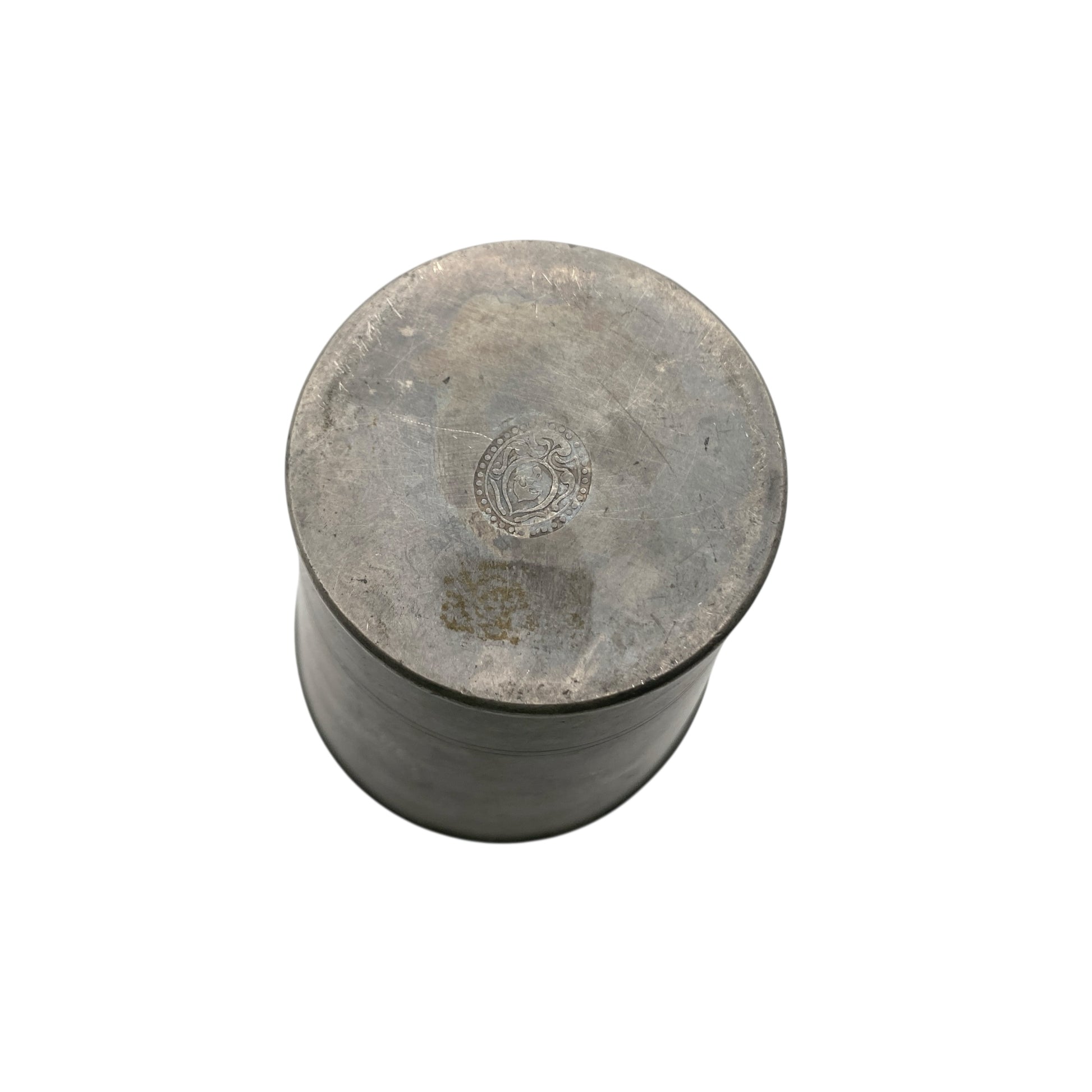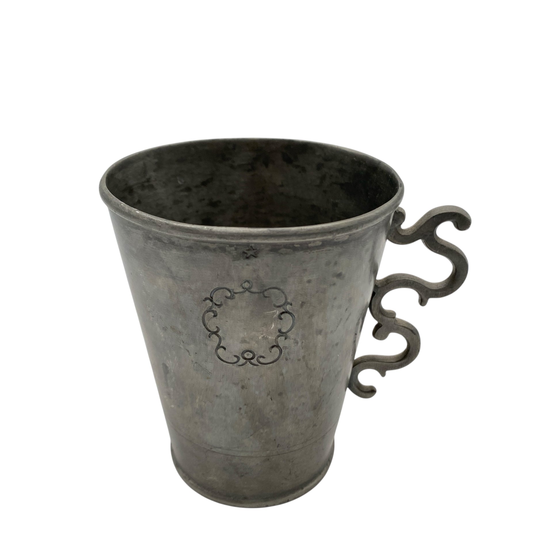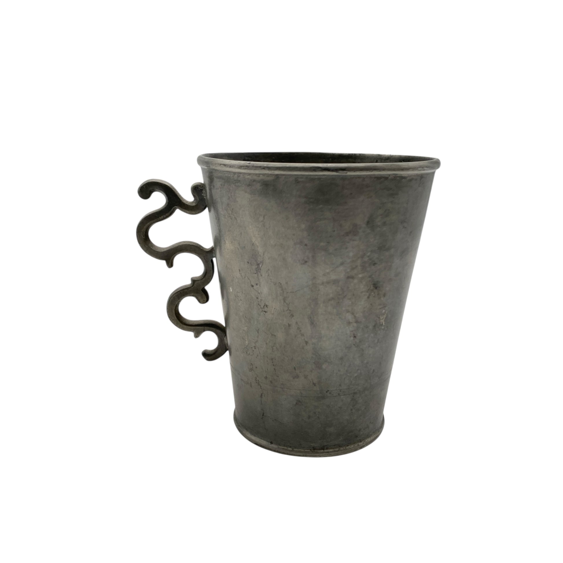 Eleganter Zinnbecher aus den 1940er-1950er Jahren mit charaktervollem Henkel und feinen Ornamentdetails. Dieses authentische Stück verkörpert die Ästhetik der Mid-Century-Moderne mit seiner schlichten, funktionalen Form und dezenten Verzierungen. Das hochwertige Zinn zeigt die handwerkliche Qualität dieser Epoche und eignet sich hervorragend als Sammlerstück oder dekoratives Element. Ideal für Liebhaber von Vintage-Design und historischen Haushaltswaren, die zeitlose Eleganz schätzen.
