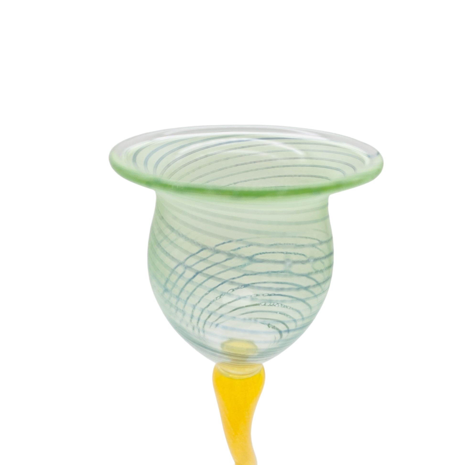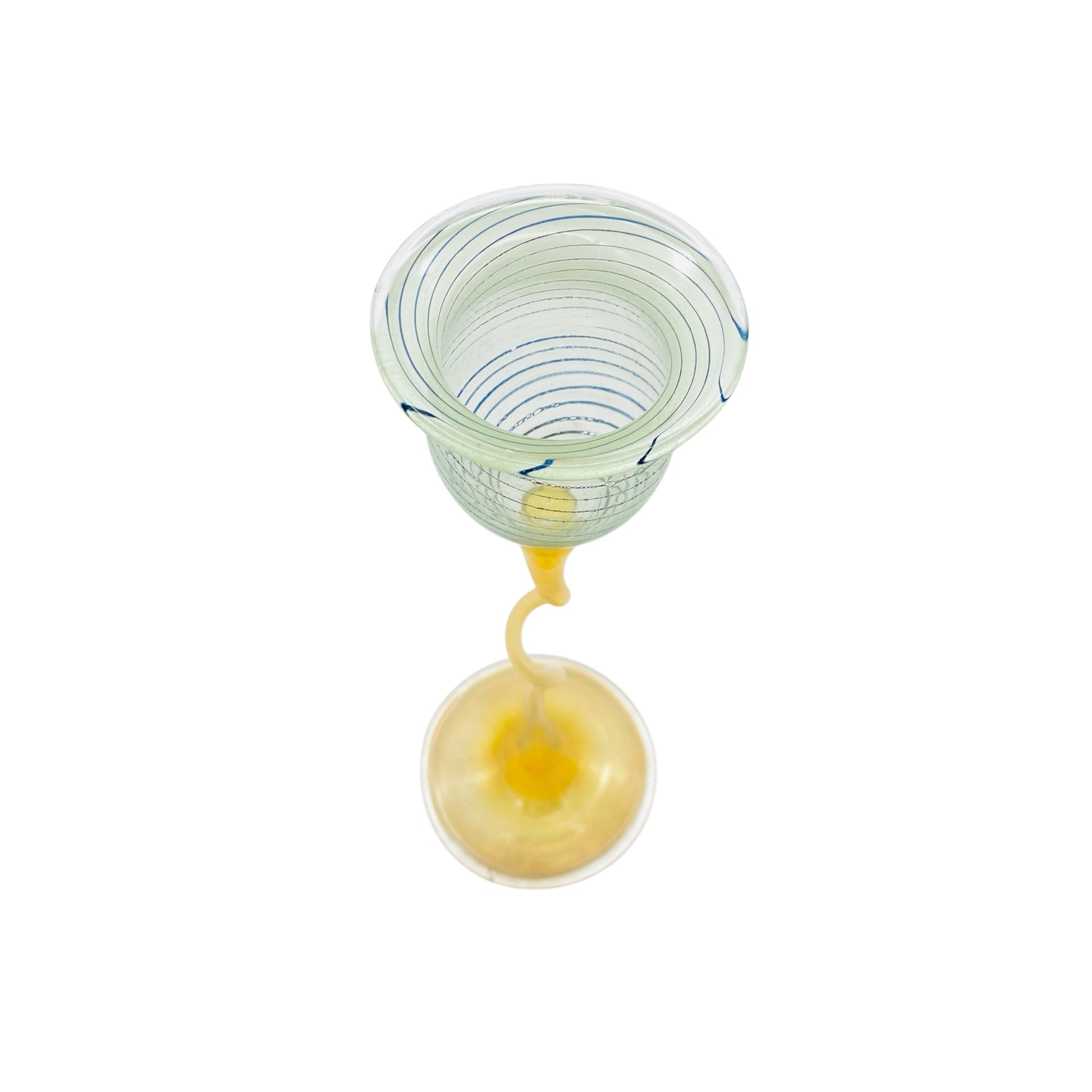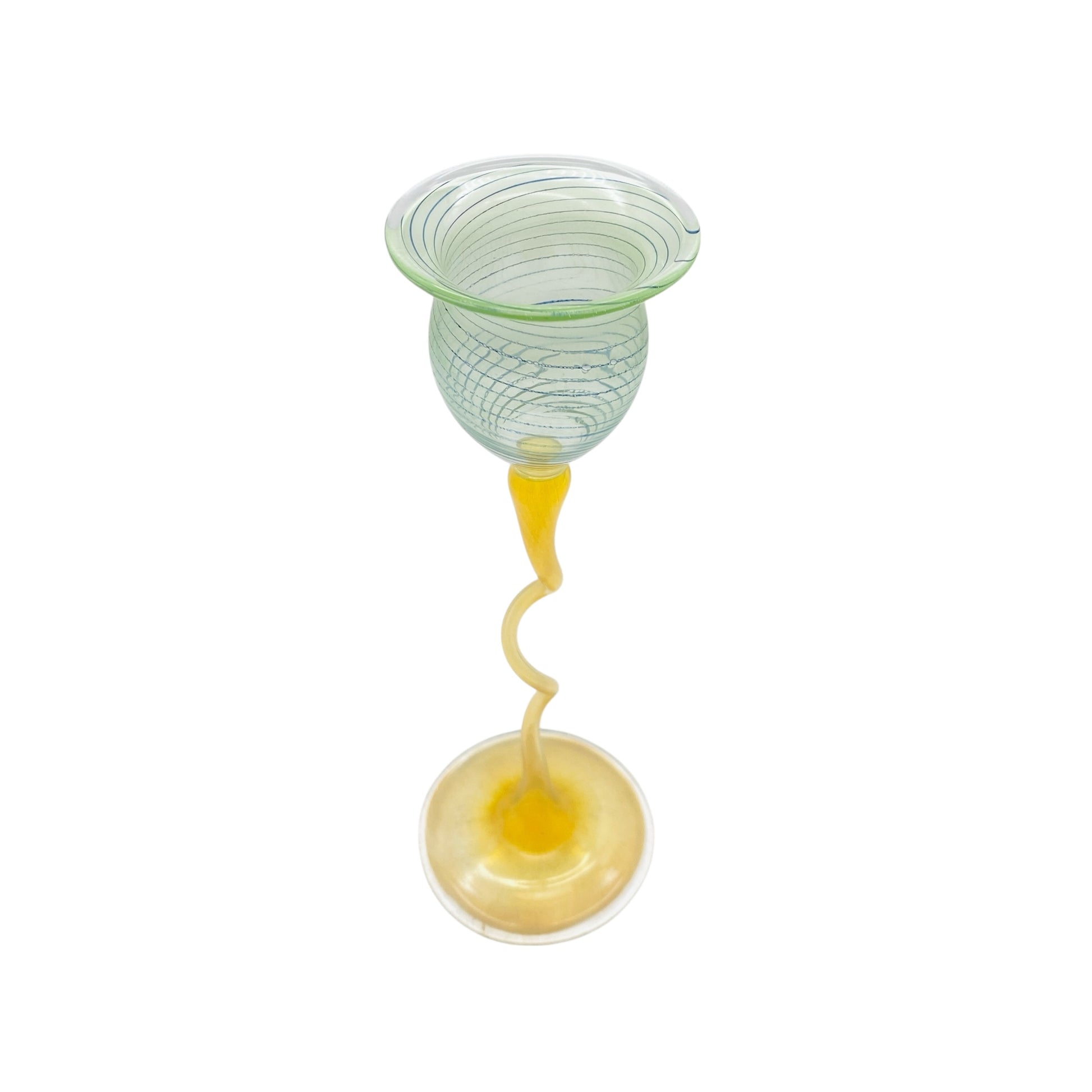 Dieses filigrane Studioglas aus den 60er oder 70er Jahren besticht durch eine bunte, handbemalte Dekoration und eine unbekannte Signatur, die dem Stück eine besondere künstlerische Authentizität verleiht. Die sorgfältige Verarbeitung und das einzigartige Design machen es zu einem wertvollen Sammlerstück und einer stilvollen Ergänzung für jede anspruchsvolle Einrichtung.