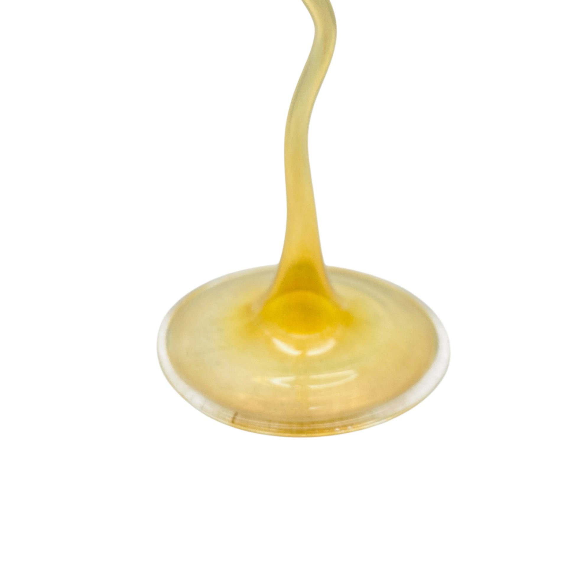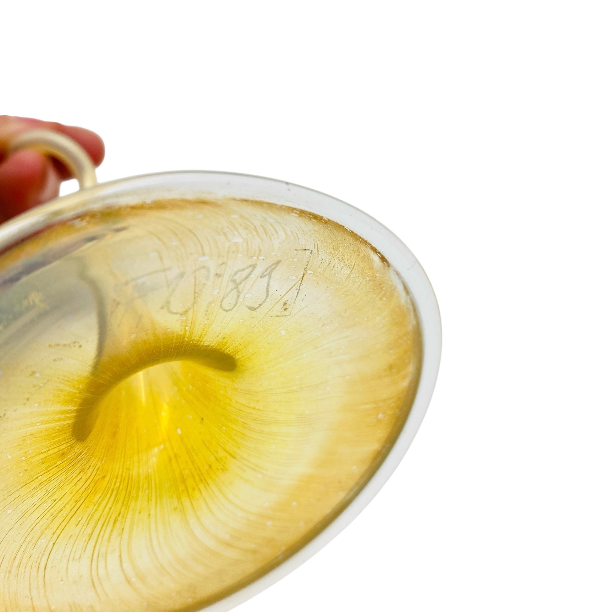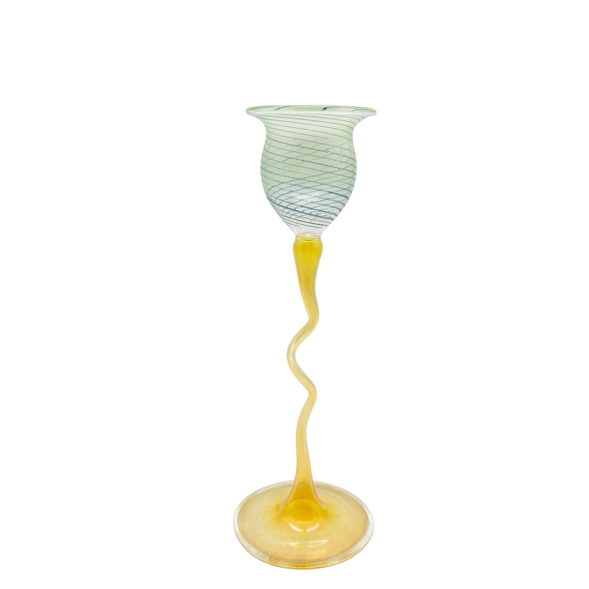 Dieses filigrane Studioglas aus den 60er oder 70er Jahren besticht durch eine bunte, handbemalte Dekoration und eine unbekannte Signatur, die dem Stück eine besondere künstlerische Authentizität verleiht. Die sorgfältige Verarbeitung und das einzigartige Design machen es zu einem wertvollen Sammlerstück und einer stilvollen Ergänzung für jede anspruchsvolle Einrichtung.