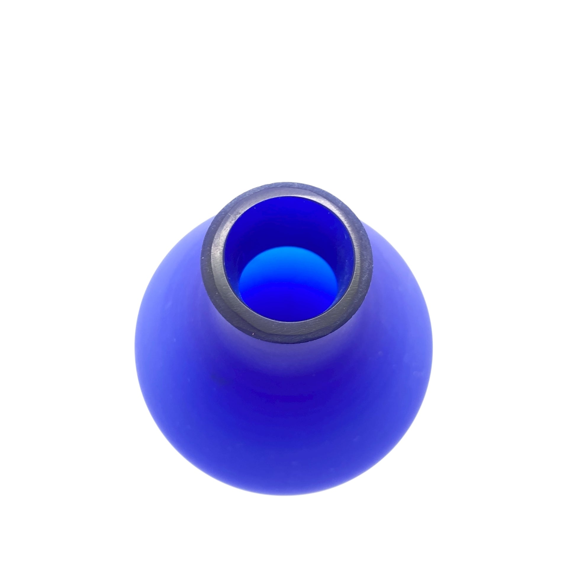 Diese vintage Vase aus satiniertem blauem Glas stammt aus den 1960er bis 1970er Jahren und verkörpert die elegante Schlichtheit des Mid-Century-Designs. Die mattierte Oberfläche und der sorgfältig beschliffene Rand zeugen von hochwertiger Handwerkskunst. Als dekoratives Element oder Blumenvase verleiht sie jedem Raum eine stilvolle, zeitlose Atmosphäre.